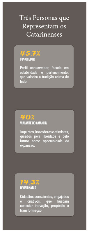 Foi executada pelo IPO (Instituto Pesquisas de Opinião) em 2025. O estudo também mapeou as três personas que melhor representam os catarinenses em relação ao seu futuro: o protetor, o viajante do amanhã e o visionário. 45,7% dos entrevistados apresentam as características do protetor, um perfil conservador, focado em estabilidade e pertencimento e que valoriza a tradição. O perfil viajante do amanhã abrange 40% das pessoas que participaram da pesquisa. São os inquietos, inovadores, otimistas, guiados pela liberdade e pelo futuro como oportunidade de expansão. O visionário, por fim, representa 14,3% dos entrevistados. São os cidadãos conscientes, engajados e criativos, que buscam conectar inovação, propósito e transformação para gerar impacto social.