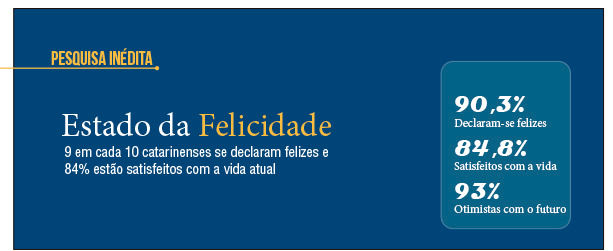 Revela que 90,3% dos entrevistados se declaram felizes e 84,8% estão satisfeitos com a vida atual. Além disso, 93% dos catarinenses projetam um futuro melhor. A Região Serrana lidera esse sentimento, com impressionantes 95,4% de satisfação e 100% de otimismo.